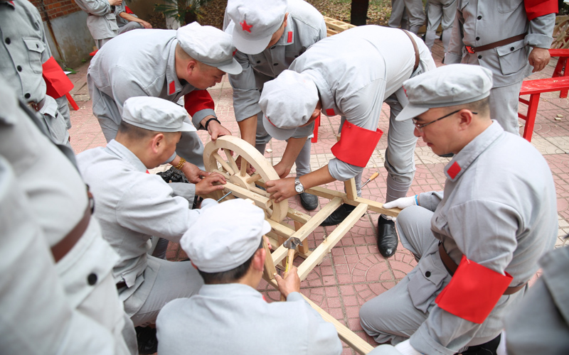 在一阵庄严的国歌声中,“忆苦思甜”红色印记拉开序幕,挥动我们手中的大刀,向革命先烈致敬;亲手打一双草鞋,体会红军战士的艰苦生活;一斧一锤做一辆独轮车,尝尝当时的艰辛滋味……