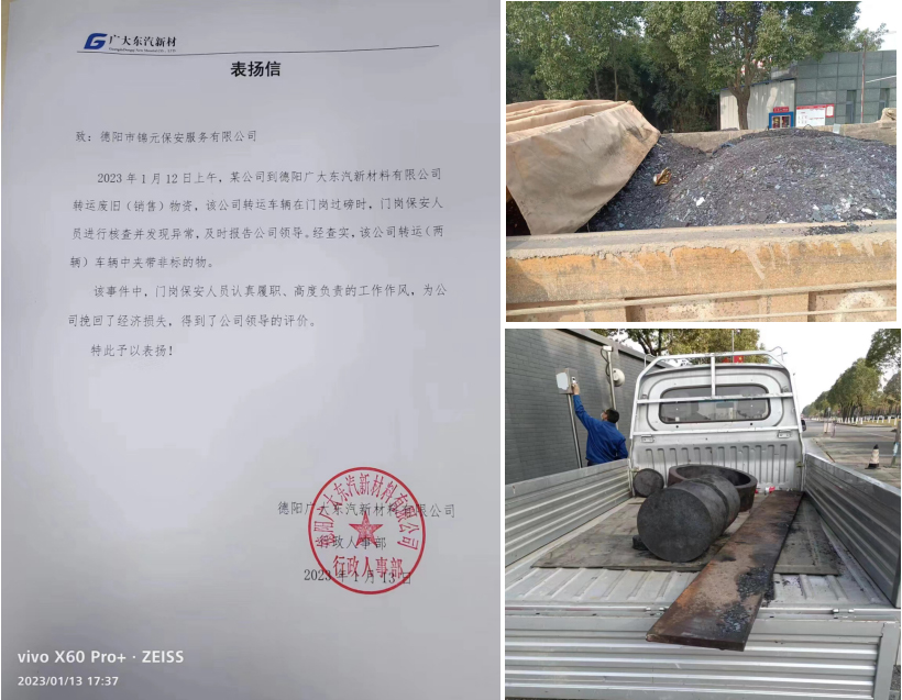 1月12日上午,我公司驻广大东汽保安班当班队员查获非法夹带物资两车,为客户挽回了一定的经济损失,我公司保安员认真履职、高度负责的工作态度得到了甲方领导的高度评价。
